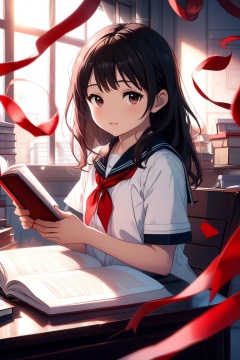 Anime, A serene desk scene: A lone girl in a crisp white school uniform sits in front of a tidy desk, surrounded by scattered red ribbons. She holds a worn book open, her gaze directly addressing the viewer with an air of quiet contemplation. Soft overhead lighting accentuates the delicate features and brightens the vibrant red hues.