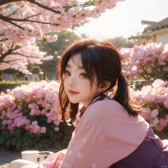 ((masterpiece, best quality)),girl, solo, looking at viewer, blush, smile, 1girl,[sitting under the sakura tree,knee up], (from below,wide shot,mid shot,full body,panorama,depth of field),(looking up),(pink petals,tyndall effect,English text) ((game cg style)),(masterpiece),(best quality),illustration,ultra detailed,hdr,Depth of field,(colorful)nes, purple theme, watercolor \(medium\), mahiro