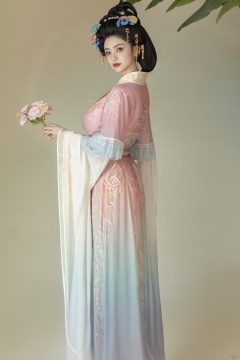 masterpiece,qingyi,danya,1girl,black hair,hanfu,(flower:1.5),realistic,hair ornament,chinese clothes,(Rainbow gradient colors dress:1.5),black eyes,long sleeves,holding,holding flower,,hanfu,,looking at viewer,(big breasts:1.79), Yunxiao_Fairy,Xhanfu