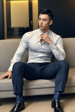 j1man,male focus,asian,exquisite facial features,handsome,muscular,pectorales,tight Collar shirt,pants,necklace,gothic style fashion,sitting on couch,navy glossy socks,footwear,in office,(masterpiece, realistic, best quality, highly detailed,profession), jzns,jmsw,