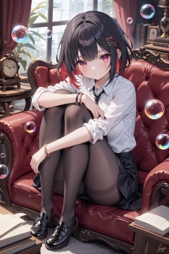 1girl, solo, pantyhose, black hair, short hair, looking at viewer, shirt, multicolored hair, red hair, bracelet, skirt, jewelry, black footwear, red eyes, shoes, white shirt, couch, hair ornament, sitting, hugging own legs, black skirt, collared shirt, bangs, sleeves rolled up, nail polish, book, two-tone hair, bubble, indoors, signature