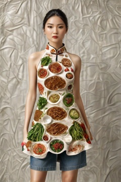 The image is an artistic representation of a female figure wearing a unique outfit. The outfit is a skirt and jeans that are designed to resemble a variety of the Vietnamese white noodles, vegetables, meat, and sauces, arranged in a pattern that covers the entire garment. The figure is standing against a plain background with a textured appearance. Notable features include the detailed depiction of the food items on the clothing and the signature of the artist at the bottom right corner. The overall impression is one of creativity and fashion, blending the concept of clothing with culinary art.,Enhanced Realistic,Pho