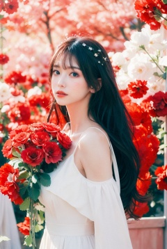 best quality,masterpiece,ultra high res,looking at viewer,huge breasts,1girl,long hair,flower,Lisianthus,in the style of red and light azure,dreamy and romantic compositions,red,ethereal foliage,playful arrangements,fantasy,high contrast,ink strokes,explosions,over exposure,purple and red tone impression,abstract,whole body capture,<lora:rixiqingxin_lora:1> <lora:hikalora:1>