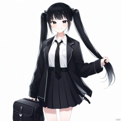 二次元风格,动漫风格,美丽的光影效果,masterpiece, best quality, 1girl, solo, skirt, black hair, necktie, twintails, jacket, shirt, white shirt, smile, long hair, black jacket, black skirt, pleated skirt, white background, bag, black necktie, simple background, looking at viewer, collared shirt, thigh strap, black eyes, long sleeves, open clothes, open jacket, signature, off shoulder, shirt tucked in, blunt bangs, breasts, cropped legs, holding hair