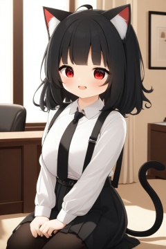 masterpiece, best quality, 1girl, solo, looking at viewer, blush, bangs, black hair, long sleeves, cat ears, cat tails, sitting, red eyes, white shirt, pleated skirt, breasts, collared shirt, indoors, black skirt, medium hair, black pantyhose, dress shirt, black tie, suspenders, suspender skirt, office, dynamic angle, cowboy shot, soft smile, two-tone hair, streaked hair