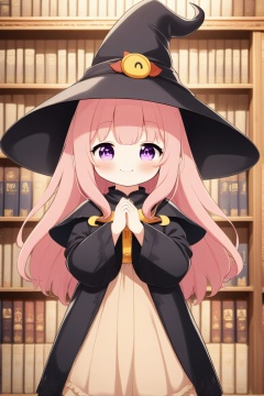masterpiece, best quality, 1girl, looking at viewer, blush, smile, closed mouth, bangs, pink hair, long sleeves, dress, bow, long hair, purple eyes, standing, smug, indoors, cape, book, witch hat, frilled dress, own hands together, puffy long sleeves, bookshelf, black cape