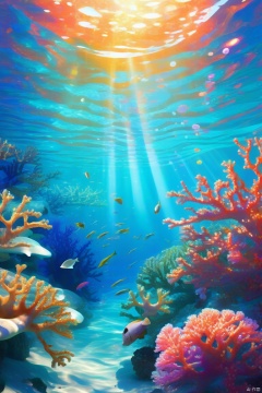 在一个充满色彩的海底世界,珊瑚礁在水中摇曳,色彩斑斓的鱼儿在其中自由穿梭。阳光透过水面,形成波光粼粼的效果,使整个海洋充满了神秘和美丽