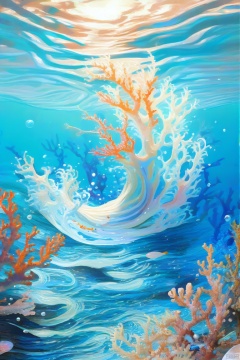 水流的笔触通过流畅的曲线表现出海洋的深邃和动感,鱼群在光影交错中游动。珊瑚礁的细节通过精致的笔触层层递进,表现出自然的复杂性。泡沫和水波在阳光下的反射增加了画面的层次和立体感,让观者仿佛置身于这个奇幻的海底世界