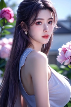 best quality,masterpiece,Yunxiao_Fairy,1girl,solo,long hair,looking at viewer,jewelry,closed mouth,purple eyes,upper body,purple hair,earrings,blurry,blurry background,sunlight,red lips,(big breasts:1.39),(Peony,full moon:1.29),