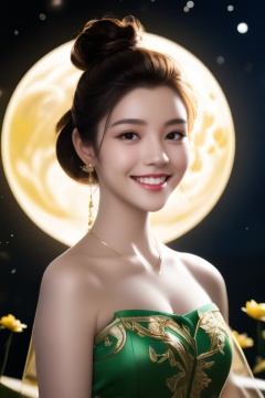 (1girl, smile, face focus, bun hair, perfect face, medium shot, gracefully, golden petals and green flowers form intricate patterns against the backdrop of the moon, reminiscent of the styles of Da Vinci), Detailed texture, High quality, High resolution, High precision, Realism, Color correction, Proper lighting settings, Harmonious composition, Behance Works,detail-rendering,Realistic Enhance,redhead,Enhanced Realistic,Truly Asian Beauty