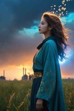 1girl, (from side), (silhouette:1.2), profile, big hair, masterpiece, best quality, light particle, depth of field, field, scenery, fantasy, indigo light, (far away:1.1), cute girl, midriff, tribal sash, pastel colors, chromatic aberration, glow in the dark dark, cloudy sky, space, orange aura, aura, cinematic, dark atmosphere, night , dark hole, glowing eyes, teal light, illumination, light rays, eye in the sky, (grass:0.9), falling petals, oniric portrait of a tall cloaked figure with a white mask, Azem the Traveler, yearning to explore the ends of the world to discover its wonders and help its denizens, by Andy Kehoe, a gradient masterpiece, blue cyan yellow, Rococopunk, luminism, seamless, China ink, Ink Bubbles, Gold leaf lines, alcohol ink elements, curved lines, cinematic, realism, chiaroscuro, Shadow play, Gold leaf small lines, bright splashes of alcohol ink puddles, volumetric light, auras, rays of sunlight, bright colors reflect, isometric, digital art, smog, pollution, toxic waste, chimneys and railroads, 3d render, octane render, volumetrics, by greg rutkowski, anime style