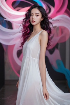 photorealistic,portrait of hubggirl, hubggirl, girl in a fluid and dynamic pose, wearing a loose, flowing white dress, mysterious expression, curly black and pink hair,hubg_jsnh, night, in a modern and abstract setting, with bold and colorful abstract art, blurred background, bright lighting, official art, uniform 8k wallpaper,(Feathers everywhere :1.3), depth of field level,