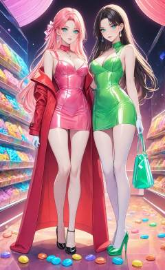 masterpiece,bestquality,candy lady,two candy ladies,green dress,red coat,sci-fi crystal background,slender legs,elegant full body posture,candy long boots,<lora:20240730-1722271406618:0.6>,<lora:detailer-xl:1>,crystal world,standing,