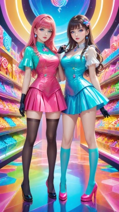 masterpiece,bestquality,candy lady,two candy ladies,slender legs,elegant full body posture,colorful top,colorful dress,colorful socks,sci-fi crystal background,candy long boots,<lora:20240730-1722271406618:0.5>,<lora:detailer-xl:1>,crystal world,standing,