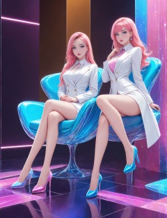 masterpiece,bestquality,candy lady,two candy ladies,white shirt,white coat,elegant sitting posture,legs,sci-fi crystal background,slender legs,candy long boots,<lora:20240730-1722271406618:0.55>,<lora:detailer-xl:1>,crystal chair,