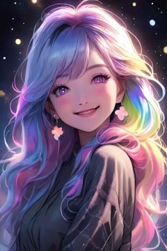 very dark nightly closeup of a hot beautiful anime girl smiling, in japan, pastel rainbow hair, ambient light, realistic textures, clear shadows, sparkling, glistening, fantastical