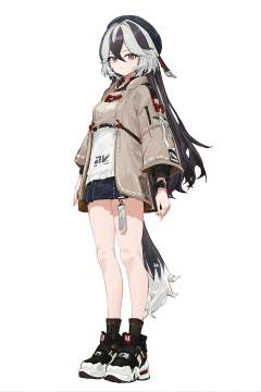 by dain, 8k, best quality, masterpiece, (ultra-detailed:1.1), (high detailed skin), (full body:1.4), white background, standing, looking at viewer, (solo:1.4), hand on hip, <lora:Coralie-kohaku-Tanger:0.8>, Coralie, def clothes, 1girl, black hair, tail, multicolored hair, white hair, long hair, jacket, dog tail, shoes, grey eyes, hat, (white background, simple background:1.3), (beautiful_face), ((intricate_detail)), clear face, ((finely_detailed)), fine_fabric_emphasis, ((glossy)), full_shot,