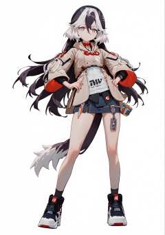 score_9, score_8_up, score_7_up, score_6_up, 8k, 8k, best quality, masterpiece, (ultra-detailed:1.1), (high detailed skin), (full body), ( white background:1.3), standing, looking at viewer, (solo), hand on hip, <lora:Coralie-pony-Tanger:0.8>,  Coralie, def clothes, 1girl, black hair, tail, multicolored hair, white hair, long hair, jacket, dog tail, shoes, grey eyes, (beautiful_face), ((intricate_detail)), clear face, ((finely_detailed)), fine_fabric_emphasis, ((glossy)), full_shot,