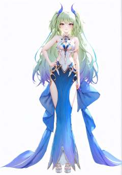 art by komone_ushio, {arsist:chen bin},[[artist:fkey]],artist:ask (askzy),artist:wlop,artist:reoen,artist:cui (jidanhaidaitang),artist:modare,artist:asakuraf,artist:void_0,artist:miv4t,artist:as109,8k, best quality, masterpiece, (ultra-detailed), (high detailed skin), white background, simple background, (full body), (white background), standing, looking at viewer, (solo), hand on hip, <lora:mobius-kohaku-Tanger-000008:0.8>, mobius, mobius's swimsuit, 1girl, breasts, long hair, green hair, multicolored hair, blue dress, twintails, blue horn hair ornaments, vertical pupil, purple eyes,beautiful_face, intricate_detail, clear face, finely_detailed, fine_fabric_emphasis, full_shot,