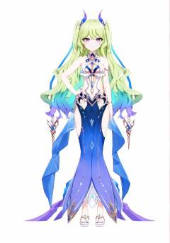 score_9, score_8_up, score_7_up, score_6_up, 8k, 8k, best quality, masterpiece, (ultra-detailed), (high detailed skin), white background, simple background, (full body), (white background), standing, looking at viewer, (solo), hand on hip, <lora:mobiusre-A3-Tanger:0.8>, mobius, mobius's swimsuit, 1girl, breasts, long hair, green hair, multicolored hair, blue dress, twintails, blue horn hair ornaments, vertical pupil, purple eyes, beautiful_face, intricate_detail, clear face, finely_detailed, fine_fabric_emphasis, full_shot,