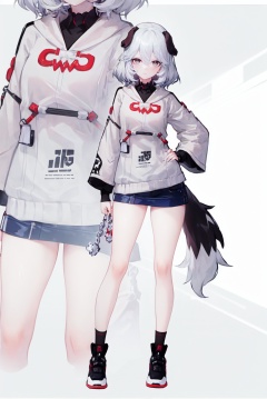 8k, best quality, masterpiece, (ultra-detailed:1.1), (high detailed skin), (full body:1.4), white background, standing, looking at viewer, (solo:1.4), hand on hip, <lora:Coralie-v100-000015:0.8>, Coralie, 1girl, black hair, tail, multicolored hair, white hair, long hair, dog tail, grey eyes, sweater, (white background, simple background:1.3), (beautiful_face), ((intricate_detail)), clear face, ((finely_detailed)), fine_fabric_emphasis, ((glossy)), full_shot,