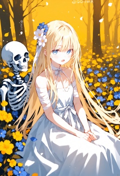 Elite,Artist:hqchr,1girl, absurdly_long_hair, bandages, blonde_hair, blue_eyes, dress, flower, long_hair, open_mouth, petals, simple_background, sitting, skeleton, solo, twitter_username, very_long_hair, white_dress