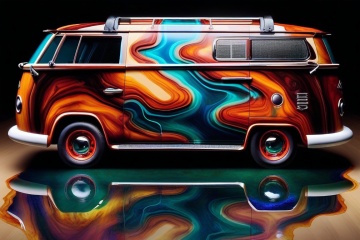 A VW campervan crafted from epoxy resin and timber, its vibrant, flowing form reflected in a shimmering pool of water. Exotic timber patterns dance across the surface, while fluid dynamic resin hues seem to flow like molten lava. The background is a blur of abstract colors, adding depth and dimensionality to the piece. No humans are present, only the still life beauty of this unique fusion concept art, AAr3s1nfl0w
