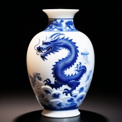 Create an image of a white Chinese vase with a Theo blue ink drawing of a Chinese dragon and a calligraphy inscription. The vase is set against a velvet black background, illuminated by a soft box light effect, highlighting the intricate details and the vibrant blue ink. The composition focuses on the vase, with the dragon and calligraphy prominently displayed, capturing the elegance and cultural significance of the piece.,Unique Masterpiece,Enhanced Realistic