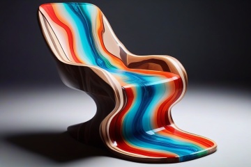 A photorealistic image of an armchair made from epoxy resin and timber, concept fusion piece, vibrant colour resin, fluid dynamic, flowing, exotic timber, detailed background, no humans, still life, reflection, shadow, water effect, AAr3s1nfl0w