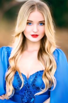woman, long hair, breasts, looking at viewer, blue eyes, blonde hair, long sleeves, dress, closed mouth, cleavage, collarbone, upper body, blurry, lips, blurry background, blue dress, realistic,photo r3al