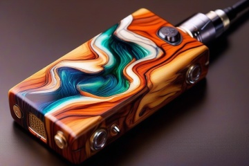 A photorealistic image of a vape box made from epoxy resin and timber, concept fusion piece, vibrant colour resin, fluid dynamic, flowing, exotic timber, detailed background, no humans, still life, reflection, shadow, water effect, AAr3s1nfl0w