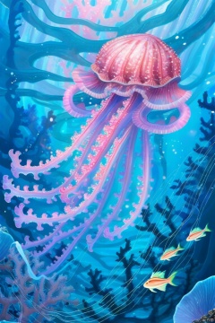 色彩斑斓的珊瑚礁和发光的水母在清澈的海水中漂浮,细致的笔触描绘出珊瑚的细节和水母的柔美光环。海底的砂石和海藻形成丰富的纹理。背景是深邃的海洋,光线透过水面洒下,形成斑斓的光斑和迷人的光影效果,整体构图展现出一个极致华丽的水下花园