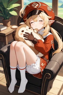 source_anime BREAK solo,best quality,highly detailed,ultra-high resolution,32K UHD,sharp focus,best-quality,masterpiece, Emotionalization,golden hour,unconventional supreme masterpiece,masterful details,temperate atmosphere,with a high-end texture,in the style of fashion photography,dynamic angle,dynamic posture, 1girl, klee (genshin impact), red headwear, sleeping, hat, solo, closed eyes, socks, pointy ears, gloves, bangs, ahoge, no shoes, red dress, brown gloves, dress, blonde hair, twintails, long sleeves, knees up, cabbie hat, hair between eyes, couch, kneehighs, object hug, low twintails, white socks, hat feather, bloomers, blurry, underwear, chair, full body, long hair, depth of field, sitting, jumpy dumpty, book, zzz,