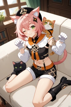 source_anime BREAK solo,best quality,highly detailed,ultra-high resolution,32K UHD,sharp focus,best-quality,masterpiece, Emotionalization,golden hour,unconventional supreme masterpiece,masterful details,temperate atmosphere,with a high-end texture,in the style of fashion photography,dynamic angle,dynamic posture, diona (genshin impact), 1girl, animal ears, cat ears, tail, cat tail, pink hair, one eye closed, cat, cat girl, hat, shorts, animal ear fluff, solo, short hair, green eyes, detached sleeves, gloves, paw print, bangs pinned back, white gloves, pillow, window, rubbing eyes, puffy shorts, paw pose, indoors, sitting, couch, black shorts, thick eyebrows, boots, navel, long sleeves, black footwear,