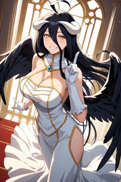 source_anime BREAK solo,best quality,highly detailed,ultra-high resolution,32K UHD,sharp focus,best-quality,masterpiece, Emotionalization,golden hour,unconventional supreme masterpiece,masterful details,temperate atmosphere,with a high-end texture,in the style of fashion photography,dynamic angle,dynamic posture,1girl, breasts, horns, solo, albedo (overlord), gloves, long hair, wings, dress, large breasts, white gloves, yellow eyes, cleavage, white dress, demon horns, black wings, ahoge, black hair, bare shoulders, looking at viewer, hip vent, detached collar, feathered wings, hair between eyes, low wings, demon girl, white horns, smile, feathers, bangs, indoors, full body, very long hair