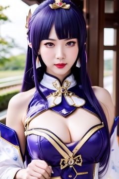 raiden_(genshin_impact). An ultrarealistic absurdres photo of a feminine 1girl with intricate facial features accentuating mesmerizing beauty and perfect model body, cosplay raiden_(genshin_impact) with obi.,ek_real_b00ster
