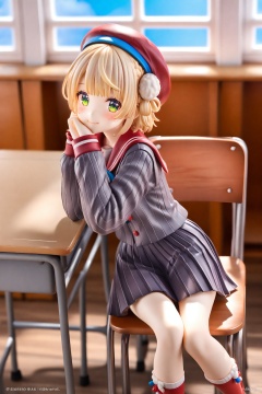 masterpiece,Realism,best quality,PVC Style, 1girl, shigure ui \(vtuber\), virtual youtuber, hair ornament, pom pom hair ornament, pom pom \(clothes\), solo, school desk, desk, hat, braid, short hair, skirt, striped skirt, beret, green eyes, classroom, striped clothes, looking at viewer, indoors, window, hair rings, red headwear, sitting, grey jacket, vertical-striped skirt, jacket, vertical-striped clothes, blurry, long sleeves, socks, blonde hair, red sailor collar, pinstripe pattern, striped jacket, grey skirt, light brown hair, closed mouth, vertical-striped jacket, french braid, school uniform, smile, sailor collar, shirt, blurry background, red socks, head rest, blush, twitter username, chair, school chair, watermark, day, pleated skirt, kneehighs, <lora:HANS-PVC22-000021:1>