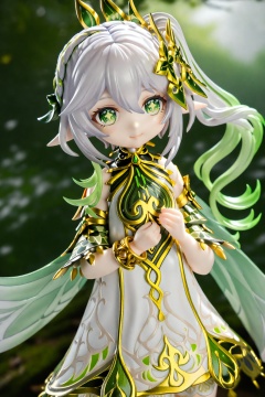 masterpiece,Realism,best quality,PVC Style,1girl, nahida \(genshin impact\), green eyes, solo, side ponytail, hair ornament, pointy ears, white hair, symbol-shaped pupils, multicolored hair, bracelet, long hair, smile, dress, looking at viewer, white dress, jewelry, blurry, hair between eyes, gradient hair, sidelocks, detached sleeves, cape, depth of field, short sleeves, green hair, green cape, leaf hair ornament, <lora:HANS-PVC22-000021:1>