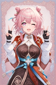 score_9,score_8_up,score_7_up,score_6_up,source_anime,source_cartoon,<lora:march 7thTponyXL-000008:1>,march 7th\(The Hunt \) \(honkai: star rail\), march 7th \(honkai: star rail\), 1girl, solo, one eye closed, v, pink eyes, pink hair, smile, bangs, looking at viewer, fingerless gloves, puffy long sleeves, open mouth, double v, hair bun, multicolored eyes, china dress, red jacket, china dress, red jacket, chinese clothes, red cape