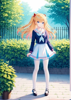 (masterpiece), (best quality), illustration, ultra detailed, hdr, Depth of field, (colorful),[rimuu:0.6, sheya:0.5,haneru,],full body, serafuku, white pantyhose,bowtie,1girl, souryuu asuka langley, blonde hair, blue eyes,seriousstanding,garden,looking at viewer, <lora:Eva08XLAni3:1>