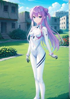 (masterpiece), (best quality), illustration, ultra detailed, hdr, Depth of field, (colorful),[rimuu:0.6, himitsu \(hi mi tsu 2\):0.5,haneru,],ruin,ruin city,  Evasuit08,plugsuit,white bodysuit, Lia, 1girl, double bun, blue eyes, purple hair, braid, shiny hair, very long hair, smile,standing,garden,looking at viewer,  <lora:Eva08XLAni3:1>,<lora:LiaXLani3:1>