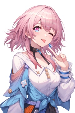 score_9,score_8_up,score_7_up,score_6_up,source_anime,source_cartoon,<lora:march 7thTponyXL-000008:1>,march 7th\(Preservation \) \(honkai: star rail\),march 7th \(honkai: star rail\),1girl,solo,one eye closed,tongue,pink hair,dress shirt,tongue out,long sleeves,tied jacket,upper body,pink eyes,white background,single earring,jewelry,breasts,hand up,black choker,simple background,medium hair,looking at viewer,;p,multicolored eyes,
