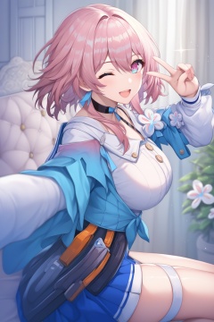score_9,score_8_up,score_7_up,score_6_up,source_anime,source_cartoon,<lora:march 7thTponyXL-000008:1>,march 7th\(Preservation \) \(honkai: star rail\), march 7th \(honkai: star rail\), 1girl, breasts, pink hair, solo, one eye closed, black choker, tied jacket, dress shirt, looking at viewer, large breasts, smile, long sleeves, thigh strap, medium hair, pink eyes, blue skirt, open mouth, sitting, flower ornament, selfie, blurry, v, multicolored eyes, from side