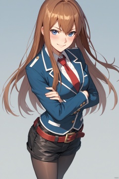 1girl, makise kurisu, solo, long hair, pantyhose, necktie, brown hair, shorts, legwear under shorts, blue eyes, crossed arms, jacket, red necktie, black shorts, smile, belt, black pantyhose, blush