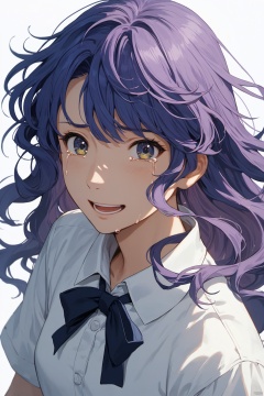 1girl, 1boy, matou sakura, purple hair, wavy hair, blue hair, short hair, long hair, shirt, tears, smile, white shirt, crying, open mouth, ribbon