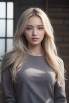 (best quality, 4K, 8K, high-resolution), ultra-detailed, best detailed, details, realistic, best detailed, details, realistic skin, skin detailed, natural skin texture, photorealism, photorealistic, intricate, elegant, highly detailed, insane details, intricate details, hyper detailed, beautiful slender woman, standing, long blonde hair, cowboy shot, grey sweater, pants, living room, photogenic