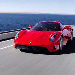 realistic photo of a Ferrari designed by Leonardo Fioravanti,Concept car,Sports car,Red color,shiny spinning wheels,glossy silver alloy rims,bright turned on head lights,driving at high speed in a coast highway,