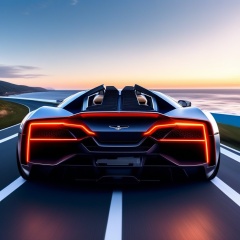 realistic photo of a lamborghini egoista,bright turned on head lights,driving at high speed in a coast highway,day,rear view,