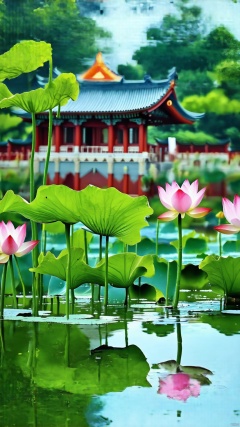 A tranquil scene featuring a Xhehua temple amidst a lotus-filled pond. The soft, natural lighting highlights the intricate details of the Xhehua architecture and the vibrant lotus flowers. The composition is centered around the reflection of the temple in the calm water, creating a serene, symmetrical image. The overall mood is peaceful and meditative, emphasizing the harmonious blend of nature and architecture.