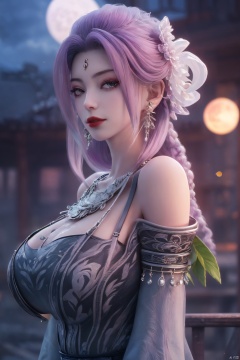 (best quality,masterpiece),Yunxiao_Fairy,1girl,solo,long hair,looking at viewer,jewelry,closed mouth,purple eyes,upper body,purple hair,earrings,blurry,blurry background,sunlight,red lips,(big breasts:1.39),(Peony,full moon:1.39),Xtianhuxiaobai